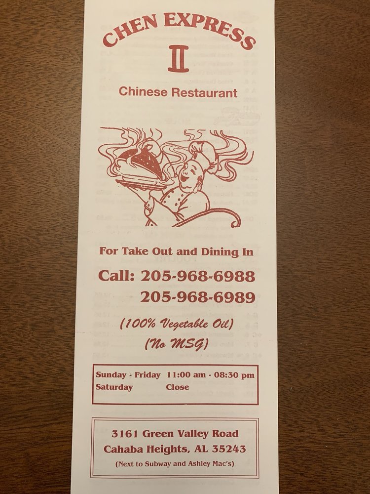 Chen Express II is a Chinese restaurant in Birmingham that offers a variety of dishes with many vegetarian options. Located at 3161 Green Valley Rd, this restaurant provides takeout, delivery, and catering services. The menu includes appetizers like Vegetable Spring Roll and Egg Roll, as well as entrees such as Hunan Chicken and Sweet & Sour Chicken. Customer reviews rave about the fresh ingredients, generous portions, and top-notch service. Some favorites mentioned include House Lo Mein, Sesame Shrimp, and Wonton Soup. With a convenient location and consistent quality, Chen Express II is a go-to spot for delicious Chinese takeout.